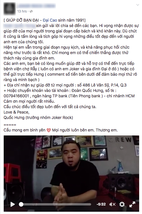Hoàn cảnh gia đình của Đại lại khốn khó, không đủ chi phí điều trị. Sau khi biết tình trạng bệnh của Đại qua những chia sẻ trên facebook, rất nhiều người đã cùng nhau gửi lời cầu nguyện cũng như hỗ trợ chi phí giúp gia đình chàng trai vượt qua khó khăn này.